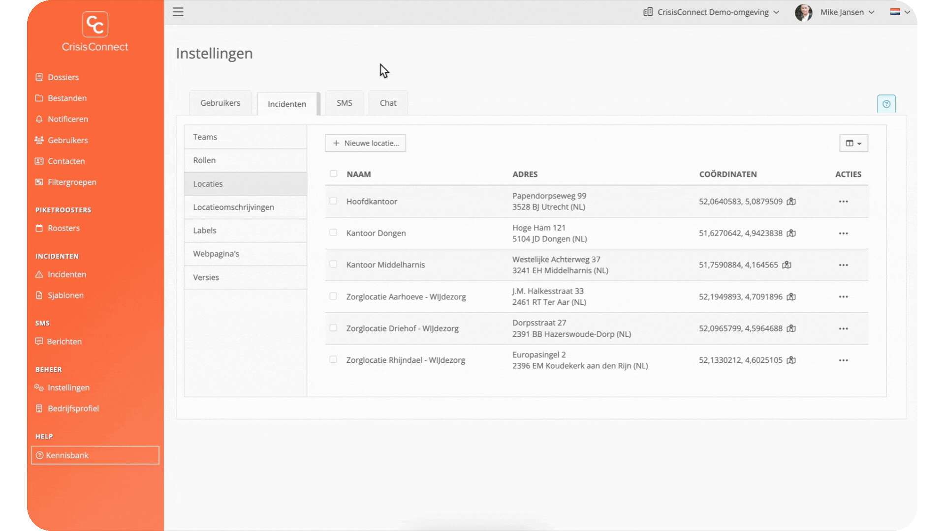 - Door op de knop ‘Nieuwe locatie’ te klikken, kun je nieuwe standaardlocaties toevoegen voor jouw organisatie. De locaties die je hier toevoegt worden zichtbaar wanneer je een incident aanmaakt. Je kunt dan simpelweg kiezen tussen reeds opgeslagen locaties. Uiteraard kun je bij het aanmaken van een incident ook een nieuwe locatie zoeken, maar dieze blijft niet bij de standaardlocaties/opgeslagen staan.